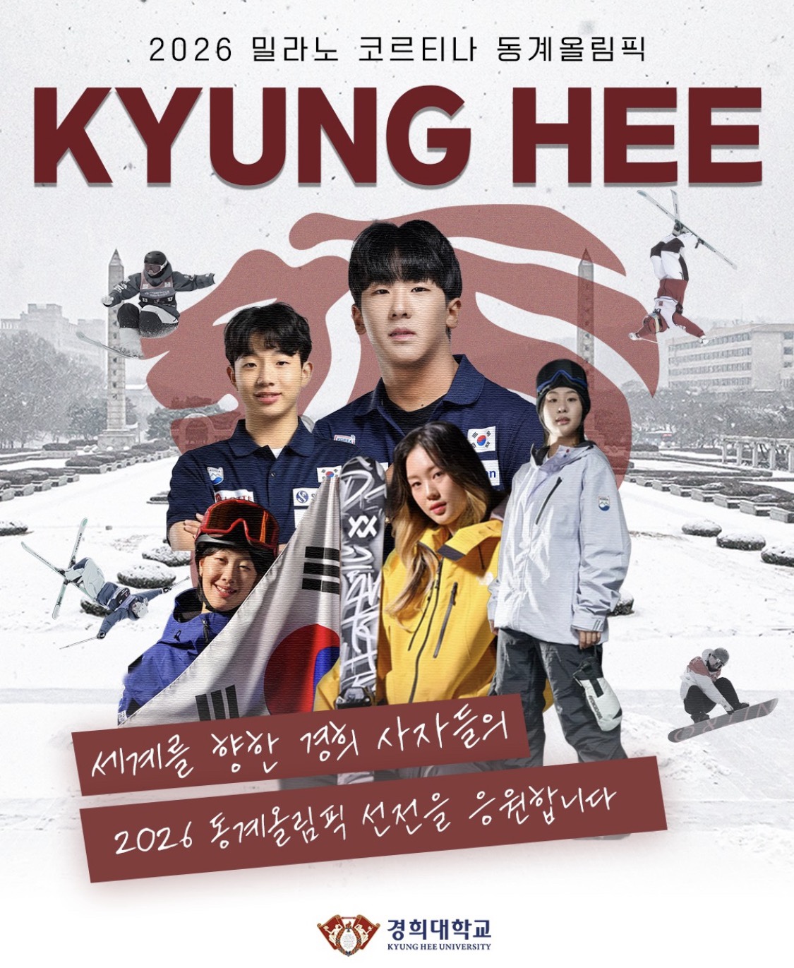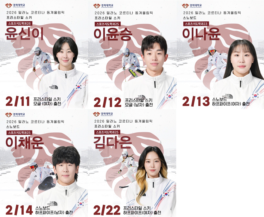 2026 밀라노-코르티나 동계 올림픽을 맞아 전 세계의 시선이 이탈리아로 향하고 있는 가운데, 경희대학교의 이름을 빛내는 대한민국 국가대표 선수들을 응원한다. 이번 대회에는 스포츠지도학과의 이나윤(23학번), 김다은(25학번), 이채운(25학번), 이윤승(25학번), 그리고 윤신이(26학번) 동문까지 총 5명의 경희인이 국가대표로 선발되어 동계 올림픽 설상 종목에서 활약을 한다.