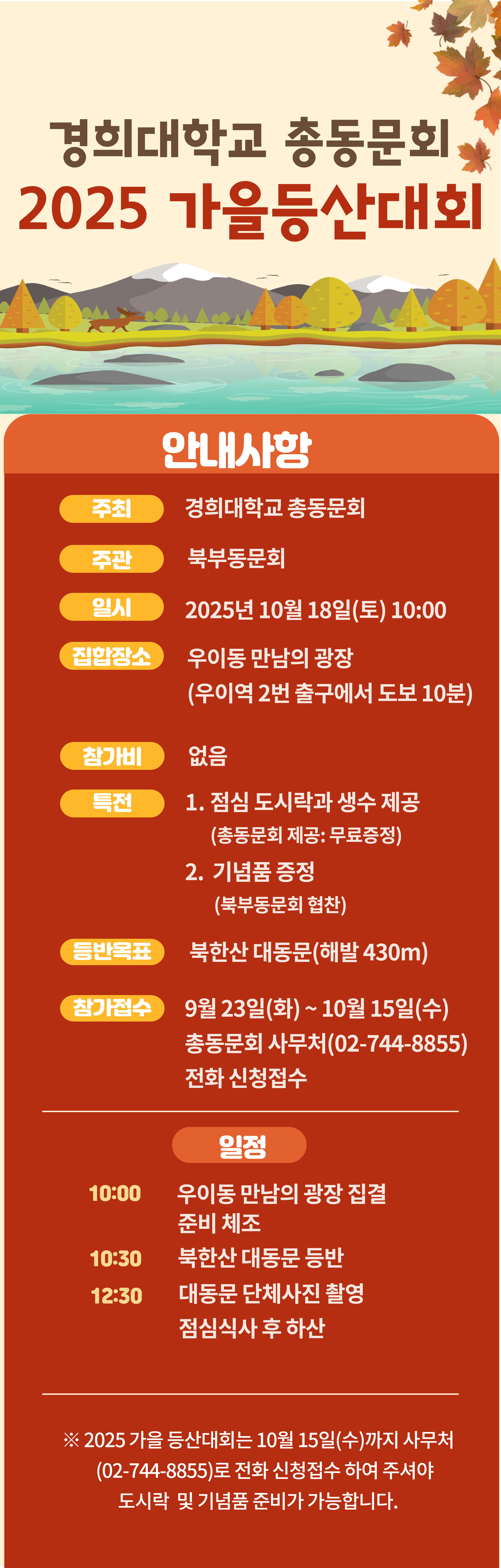 2025 가을등산대회 → 우천관계로 취소 작성일 2025-10-13 10월 18일(토) 개최 예정이었던 "2025 가을등산대회"는 10월 13일(월) 오후 1시 기준으로 기상청 일기예보 강수율 90%에 해당되므로 동문님들의 안전을 고려하여 취소 되었습니다.