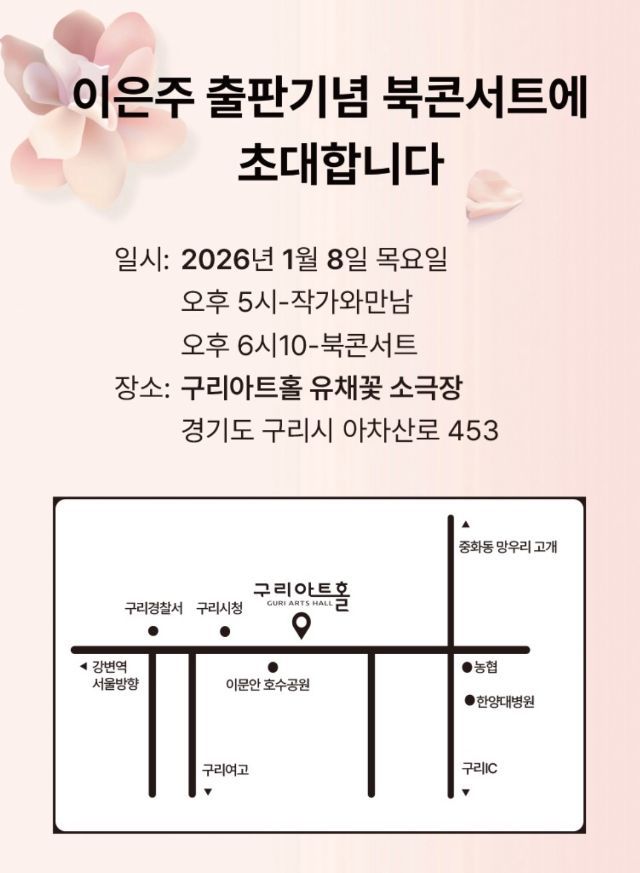 북콘서트는 2026년 1월 8일 (목), 경기도 구리시 아차산로 453(구리아트홀), 유채꽃 소극장에서 열리며, 작가와의 만남, 북콘서트 등의 행사로 구성되어 있다.
