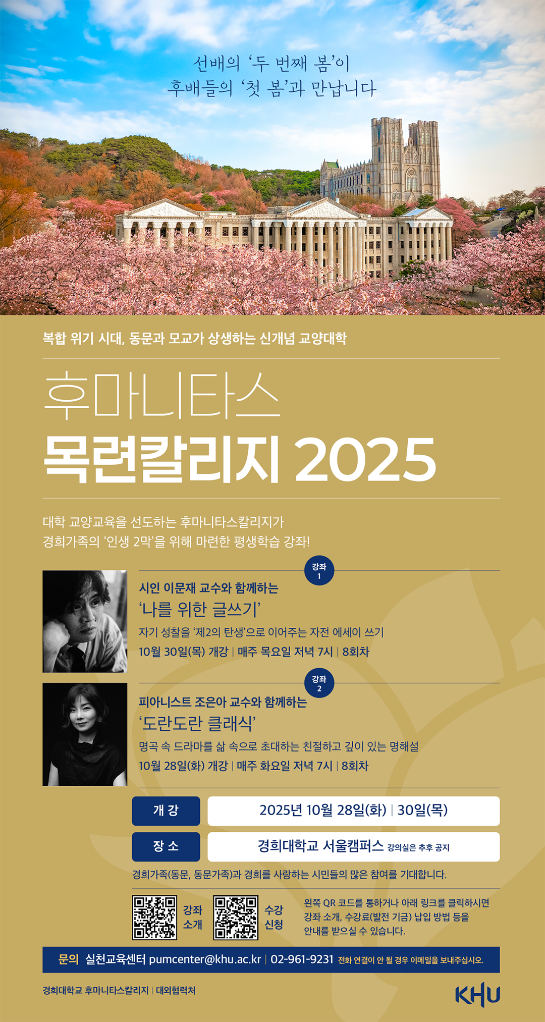 경희대학교 무료 평생학습 강좌 "후마니타스 목련칼리지 2025" 개설 작성일 2025-10-02 경희대학교가 동문 및 동문가족을 위한 무료 평생학습 강좌 "후마티타스 목련칼리지 2025" 를 개설했습니다. 동문님들의 많은 참여 부탁드립니다!** 강좌 안내 https://drive.google.com/file/d/1sT-Zo8yEqzrhAgx-11mxbv9TTBBSEGdC/view?usp=sharing