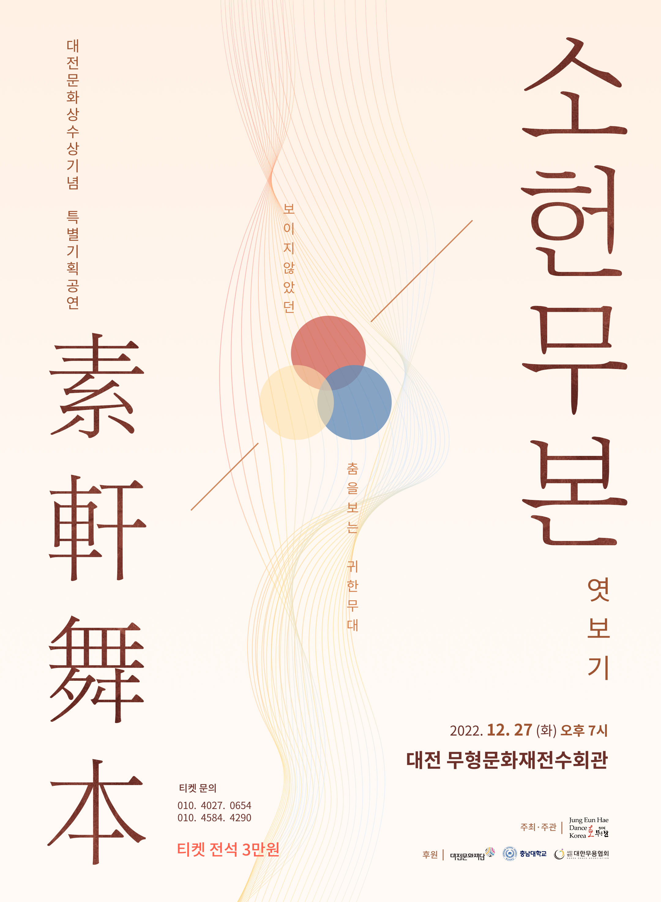 경희대학교여성총동문회 정은혜(무용76, 충남대 교수) 회장 '소헌무본' 공연 개최 총동문회 0 1489 2023.01.10 11:20 경희대학교여성총동문회 정은혜(무용76, 충남대 교수) 회장은 지난 12월 27일(화) 대전 무형문화재전수회관에서 '소헌무본' 공연을 성황리에 개최하였다.이번 공연은 대전문화상수상기념 특별기획공연으로 '보이지않았던 춤을보는 귀한무대'로 대전문화재단과 충남대학교, 대한무용협회가 후원하였다.