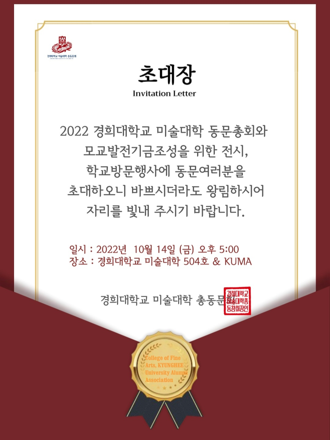 2022 경희대학교 미술대학 동문총회 주최 모교발전기금조성을 위한 전시, 학교방문행사 총동문회 0 1132 2022.10.12 09:48 경희대학교 미술대학총동문회는 2022년 10월 14일(금) 오후 5시부터 미술대학 504호와 KUMA에서 전시회를 개최한다