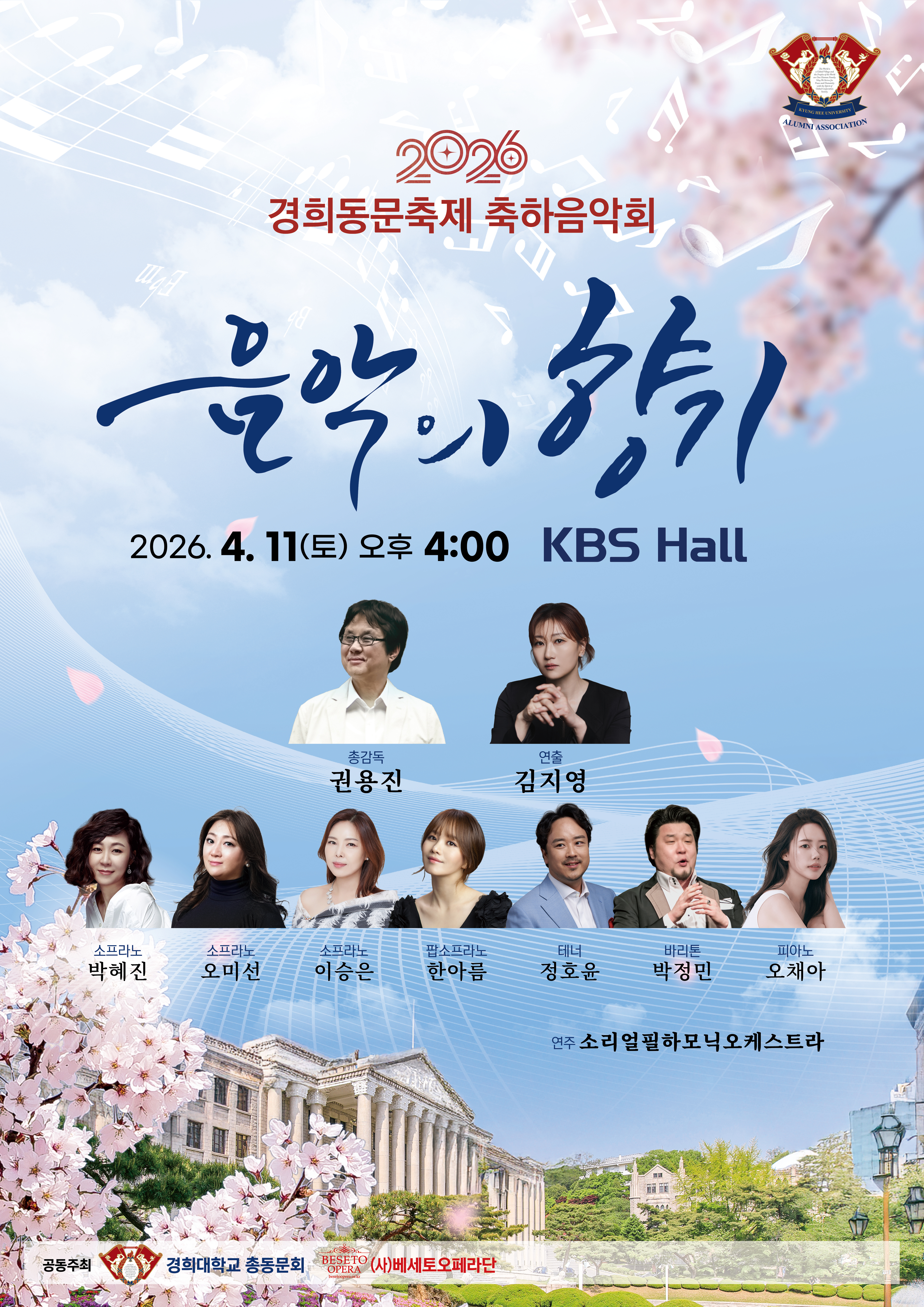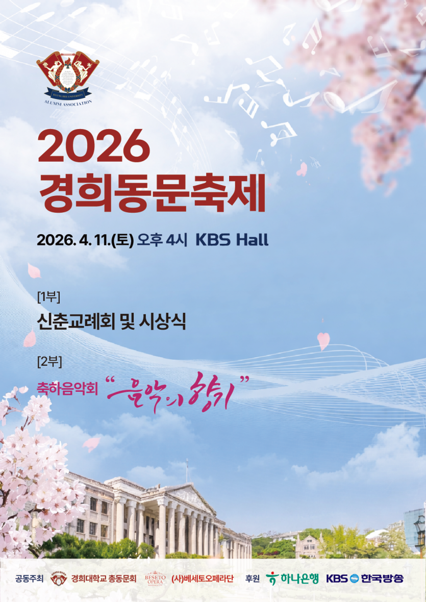 경희대학교 총동문회는 2026년 4월 11일 (토) 오후 4시부터 국회의사당역 인근 KBS홀에서 <2026경희동문축제>를 개최하여 동문 여러분의 성원에 보답드리고자 합니다.