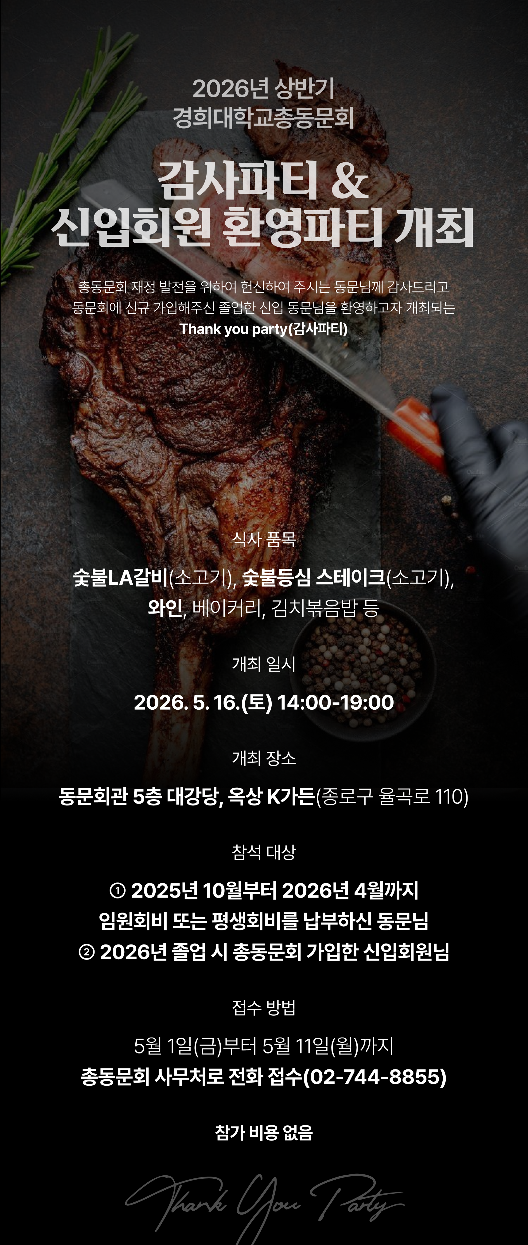 2026년 상반기 감사파티 개최 작성일 2026-02-25 항상 총동문회를 위해 힘써주시는 동문님들의 마음에 보답하고자, 2026년 춘계 감사파티를 개최하오니 동문님들의 많은 관심과 참여 바랍니다.