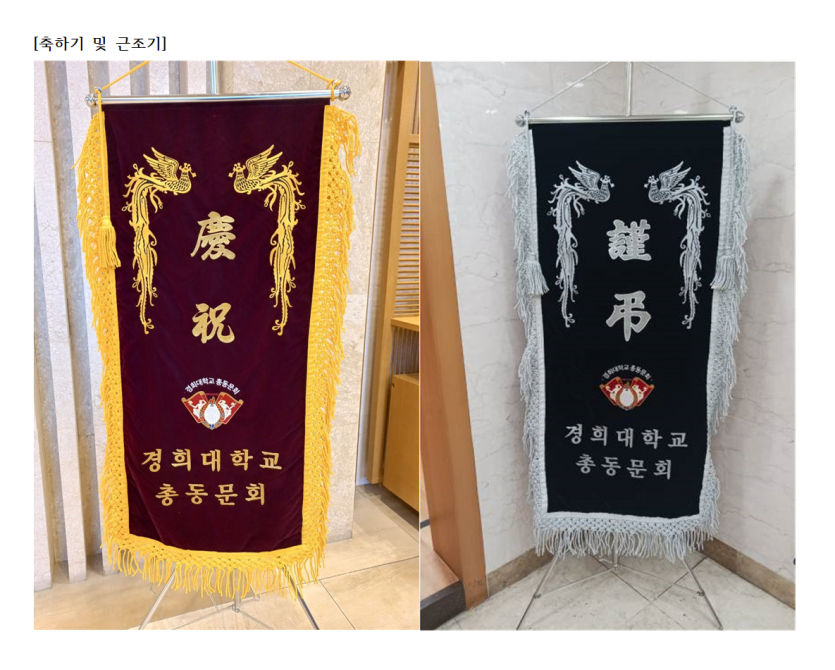총동문회는 경조사 시 평일에는 총동문회(02-744-8855)로 연락을 주시고, 주말·공휴일에는 총동문회 사무처장(김민석 010-8347-7464)으로 문자 연락을 주시면, 근조기와 축하기를 발송 드립니다.